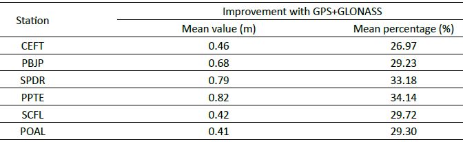 Adding GLONASS to GPS data improved the positioning results in most part of the cases, mainly when smaller collection times were considered. Considering all configurations tested for all the stations with 30-minute data, the use of GPS/GLONASS data provided better results in 97.35% of the cases, the mean improvement was about 60 cm (30% improvement). The mean increase in the number of satellites visible with combined data was nine vehicles, which corresponds to a 70% improvement.