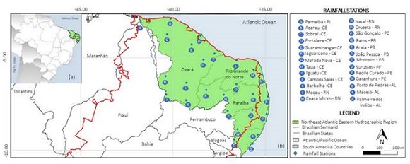 The (NAEHR) (see Fig. 1b) is one of the 12 hydrographic regions in Brazil (see Fig. 1a) that occupies 3.4% of the national territory with an area of approximately 286,800 km², covering six states: Piauí, Ceará, Rio Grande do Norte, Paraíba, Pernambuco and Alagoas (ANA, 2015). Its location (almost all) belongs to the Brazilian Semi-Arid Region, which the lowest water availability in Brazil, with prolonged droughts periods and high temperatures throughout the year. In addition, it has a great economic and social importance for the region, covering about 740 municipalities and five state capitals (Ceará, Rio Grande do Norte, Paraíba, Pernambuco and Alagoas). The region has its greatest water demand considering urban supply and irrigation (ANA, 2018).