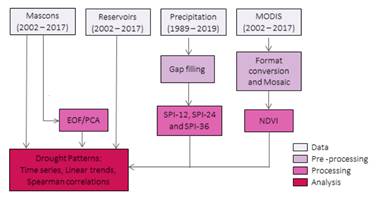 The use of remote sensing can complement hydrographic studies such as the Moderate Resolution Imaging Spectroradiometer (MODIS) on board of the Aqua and Terra satellites. In this case, the drought quantification, take advantage of spectral indices and water balance simulations (Cunha et al., 2015). The MODIS products used for terrestrial applications, aimed to monitoring the planet’s vegetation cover, able to identifying changes, either resulting from climate or weather changes (Justice et al., 2002). Deus and Gloaguen (2013) combined MODIS data and the Modified Normalized Difference Water Index (MNDWI) to identify the water changes over Lake Manyara, Tanzania. Son et al. (2012) used MODIS to monitor agricultural drought in the Lower Mekong Basin in Southeast Asia that covers Thailand, Laos, Cambodia and Vietnam. Gu et al. (2007) used the MODIS sensor to assess drought by physical indexes in the central United States of America. Likewise, Andam-Akorful et al. (2017) used the vegetation index retrieved from the Advanced Very High Resolution Radiometer (AVHRR) to assess the human influence on the water resources of West Africa. In Brazil, Anderson et al. (2010) used the MODIS sensor products to study the Amazon forest crowns drought, whereas Morton and DeFries (2005) used MODIS to assess the annual Amazon deforestation.