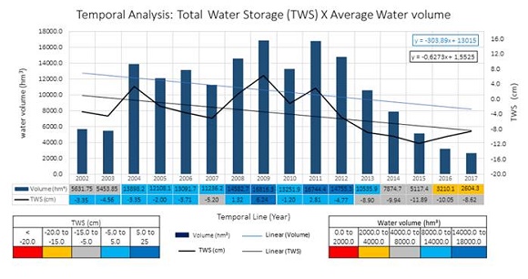 The year 2009 obtained the largest reservoirs volume of water, with 16816.28hm³ and TWS = 10.24cm. The month of May presented the highest contribution for this variability, showing a volume of 18,331.59hm³ and TWS = 23.01 cm. The EOF’s analysis enabled a better understanding of the spatial distribution and temporal changes of TWS in the study region and the respective frequencies associated with these variations.
