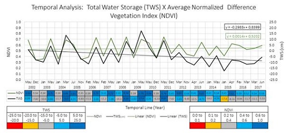 In general, the NDVI corroborates with the variations presented by TWS. Both variables showed the same behaviour throughout 2002-2017. The positive variations in TWS reflected on NDVI values close to 1.0, as occurred specifically in the first half of each year, thus indicating a dense vegetation cover that normally needs a greater hydric demand. On the other hand, NDVI also response to the dry period identified in the study, e.g., the results between 2012-2017 dropped in maximum values varying between 0.4 and 0.6.