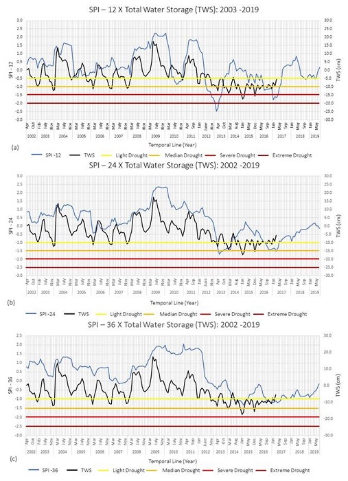 The three scales studied in this research are long-term, applied for hydrological droughts studies. The SPI makes the precipitation comparison of the consecutive months for each scale using the time series. For all cases the SPI-12-24-36 showed a moderate and strong correlation witch TWS. The scales of 24 and 36 months do not describe the drought over 2002-2019 in detail. The 6-year long drought that occurred between the years 2012 to 2017, was identified in all SPI scales used in the methodology, this was due to the duration of the drought event that exceeded 36 months, such scales are represented by Figure 5 (a), (b) and (c).
