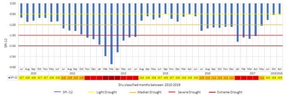 Figure 6 shows the months classified as dry and its respective intensities from 2002 to 2019. As can be seen in figure 5 (a), only in 2010 signs of drought are detected. From November 2012 to July 2013 were the longest duration of severe and extreme drought within the period of the last drought in the northeast of Brazil (2012-2017).