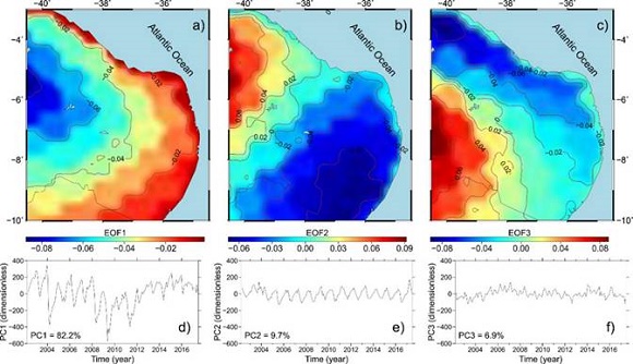 EOF2 (see Fig. 7b) is associated with PC2 (see Fig. 7e), which represents the annual variability 1 cpy and semiannual 2 cpy of the TWS, this indicated in the periodogram. The spatial distribution of this variability indicates a gain in the north-west region, and a decrease in the south-east region of the study case. The EOF3 represents the spatial variation of the temporal variations associated with the annual cycle and the intra-annual variation of 2.27 cpy observed in the PC3 periodogram (see Figs. 7e and 7f). The largest variations are concentrated in the central/southern-western region, and the smallest are concentrated in the northern-western of the study region.
