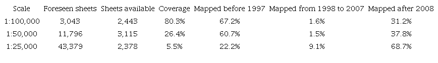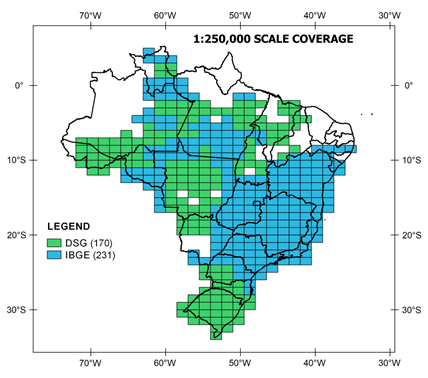 Until 1997, cartography in the 1:250,000 scale was composed by 401 traditional topographical sheets, i.e. printed or PDF format sheets whose mapped area was delimited by a surrounding polygon of 1°30’ longitude by 1° latitude. These sheets were almost all produced in the 1980s, compiled from large scale charts, when existing, or otherwise by aerophotogrammetric processes. This represented coverage of 72.9% of the total number of 550 sheets intended for this scale, as shown in Figure 1.