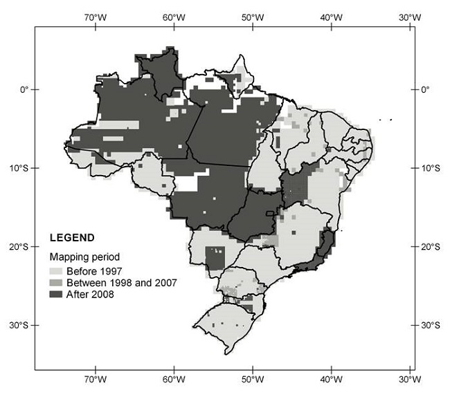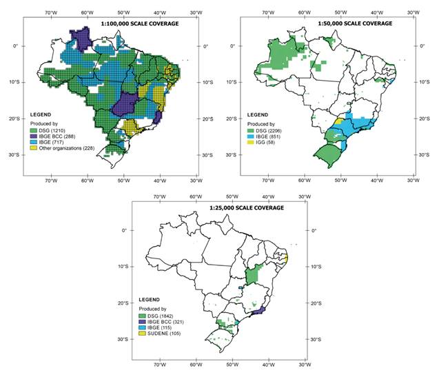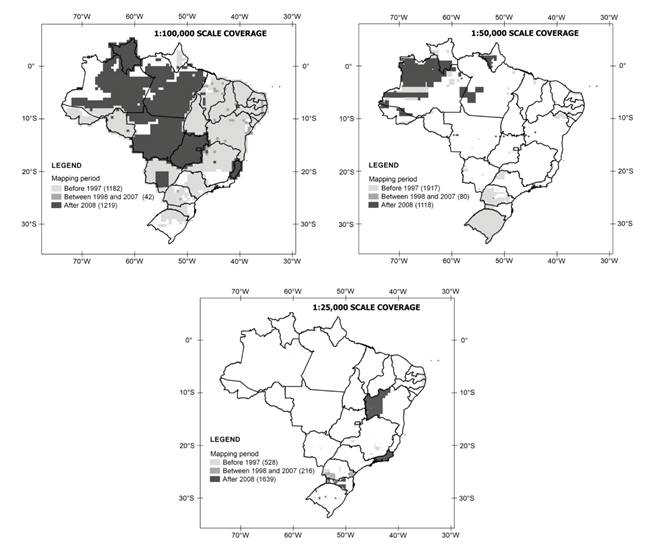 Information about cartographic coverage was obtained from several sources such as: digital index map of Brazil; army geographic database; INDE’s portal and metadata catalog; and compilation of various mapping projects produced in partnerships with other federal or state organizations.