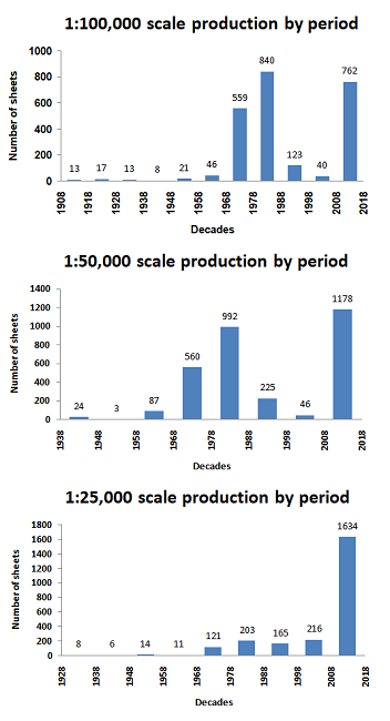 Figure 5 presents the quantities of mapping sheets produced by decades and according to the scale.