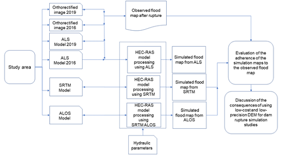 The working methodology is focused on how and under what conditions using different types of digital elevation models influences the delimitation of the flood and what are the impacts that may arise from the choice of each model evaluating if surface models such as those derived from SRTM and ALOS_ASF are suitable for this type of analysis Figure 1 shows an overall view of the main working steps and the interactions of the stages.