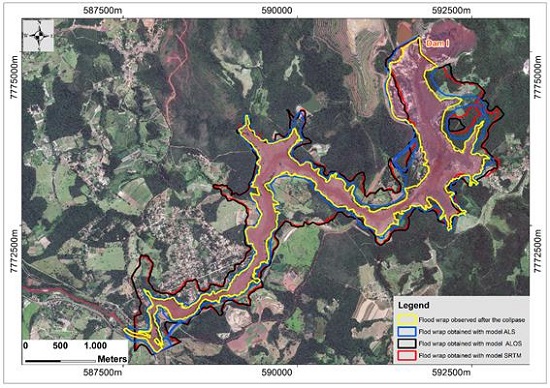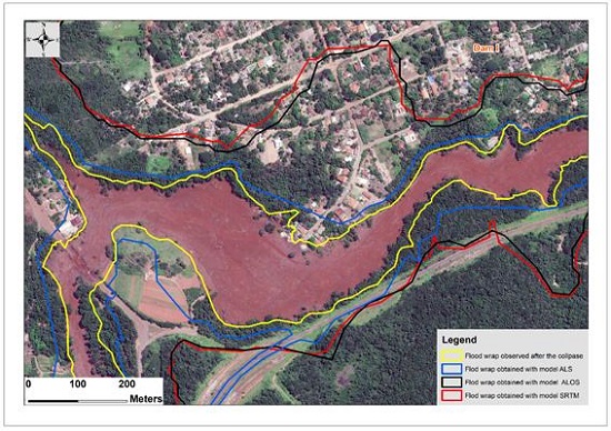 Figure 6 shows the flood map observed after the collapse of Dam I. This flood map is used a reference for comparison with the results obtained in the simulations using the three different digital models ALS, ALOS_ASF and SRTM, allowing an analysis about what are the differences, which situations are possible, what are the impacts on the necessary actions resulting from the simulation studies of dam break and evaluate if the use of surface models such as those derived from SRTM and ALOS PALSAR are suitable for this type of analysis.