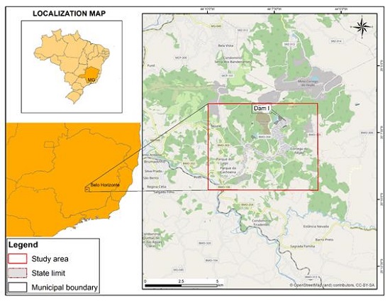 The study area comprises the region potentially flooded by the Dam I collapse. The accident was responsible for the contamination of neighborhood water bodies reaching the Paraopeba River, the watershed main river (Dutra and Elmiro, 2020). The area is situated in the municipality of Brumadinho, in Brazilian state of Minas Gerais as illustrated in Figure 2. This scenario was chosen just because it provides an unparalleled opportunity to effectively evaluates the flood patches conformity of simulated studies when compared to that of ground truth, that is, the areas effectively impacted by the dam failure itself.