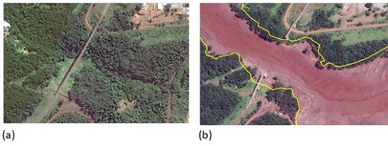 High resolution orthophoto images obtained through aerial photogrammetric survey performed before and after the collapse of Dam I were used for the delimitation of the area impacted by the dam burst. The photogrammetric mapping project carried out by Fototerra company adopted the use of large format digital camera Z1 DMC, 120 mm of focal length, 106.16 mpixel, 12 bits of radiometric resolution and red, green, blue and near infrared spectral bands.
