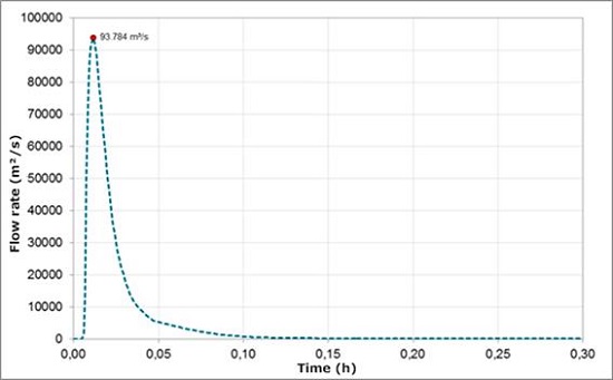 The rupture hydrogram graphically represents the variation of the effluent flow of the dam over time, with the peak flow being characterized at the top of the hydrogram at a given time (Faria et al. 2019). The collapse hydrogram, shown in Figure 5 was used as input in this research. It considered the hypothesis of instantaneous collapse of the Dam I, without taking into account the premise of gradual development of the gap limited by the time of formation (Potamos, 2018).