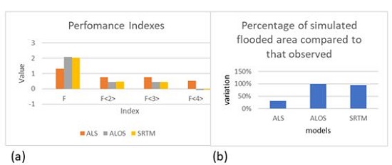 All simulations from ALS, ALOS_ASF and SRTM overestimated the observed flood, what becomes convenient because of its conservative nature. However, the free cost models almost doubled the flood overestimation, indicating that free cost models considerably increase the costs of planning actions for minimizing the impacts and the effects associated to a possible collapse.