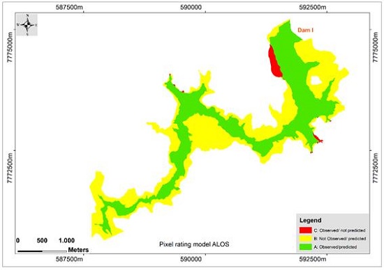 An interesting point to be noted is that in the result obtained in the simulation using the ALS model, the percentage of area fitting the condition observed and unforeseen is very close to zero, meaning that almost all observed flood was predicted in the simulation using the ALS model, different from the results obtained using the ALOS_ASF and SRTM models. It must be emphasized that the exclusion of areas with potential to be reached in the event of a collapse is more dangerous because it compromises prevention and rescue actions.