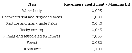 The Manning coefficient is a factor associated with the resistance of the fluid through the channel, being responsible for the loss of pressure in the flows due to the viscosity of the fluid and the roughness of the channel. It is of great importance for obtaining models that aim to study the behavior of floods and sediment transport through channels (Abbas, Abbodi and Ibrahim, 2020). The values used in this research for the Manning coefficient originate from a land use and classification map produced and described in technical reports by water resources specialized companies (Potamos, 2018). Table 1 shows the variation of the Manning coefficient depending on the type of soil cover.