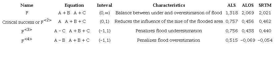 The F<4> index, whose main objective is to evaluate the overestimation of flooding, again indicated a better performance of the simulation with the model ALS, presenting negative results for the simulations obtained with both models ALOS_ASF and SRTM. That is because in the simulations with the free cost models, the number of cells correctly classified was less than the amount predicted in excess. See Figure 11, presented in Results Section, to observe the areas of types A, B and C for the flood map obtained through the ALS model.