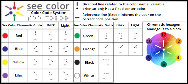 The See Color code system (Figure 2) designed by Sandra Marchi was inspired by Braille writing and the Chromatic Triangle, developed to teach color theory to people with visual impairments, who also share the same visual culture (Marchi, 2019), even having no experience of the physiological codification of luminous fluxes by the sense of sight. The See Color code was designed analogous to a clock, containing the primary colors at its markings: red (12 o’clock), yellow (4 o’clock), and blue (8 o’clock). The secondary colors were positioned between them: orange (2 o’clock), green (6 o’clock) and purple or lilac (10 o’clock). Each tactile symbol of the See Color code has a fixed center point of origin “.” and a dash “|”called Directed Line, which is similar to the hour hand on a clock. It characterizes the hue of the color, analogously to a chromatic hexagon. Darker hues have an additional point to the left of the center point, and lighter hues have an additional point to the right of the center point. Below the central point is a fixed horizontal line “_” that is a reference element to guide the user on the correct position of the code.