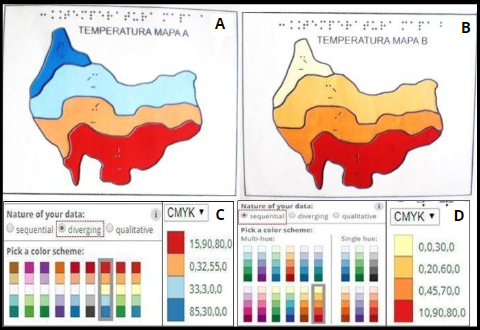 The temperature data were considered sequential and diverging, as they were ordered by intervals below 15° with amplitude of up to 30°C, and thus composed of divergent regions, either hot or cold. Finally, the See Color codes corresponding to the following hues were selected: dark blue, light blue, light orange, and dark red, which respectively represented the classes 3°C to 15°C, 15.1°C to 21°C, 21.1°C to 24°C, and 24.1°C to 30°C on Map A. Similarly, light yellow, dark yellow, orange, and red represented the same intervals on Map B. The legends of the maps were omitted to check if the colors would have a representative meaning for blind people in the interpretation of the maps. Otherwise, the users’ answers about the color’s thermal sensation could be associated with the numerical values informed in the legend and not with the subjectivity of the color meaning. The orientation from north to south was reversed to avoid possible relations with the conventional shape of the map of Australia. The orientation of the study area was omitted to avoid any correlation with the Brazilian climatic characteristics (Araújo et al. 2020).