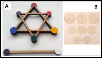 Before the maps were analyzed, the hexagon of the See Color code system was explained to users individually with the aid of an appropriate pedagogical kit containing the color codes in acrylic resin for memorization. The time for learning See Color and completing tasks with the maps was recorded together and totaled an average of 38 minutes per blind person. About users with normal color vision, the time for tasks was not recorded, as it was not essential for research. The tactile material adopted in tasks with the blind users integrates two models of color maps: one with a divergent scheme and another with a sequential scheme printed on swell paper with tactile relief; a See Color kit (Figure 6) consisting of two wooden triangles with acrylic circles at the ends with a specific color code in relief; a computer with internet to researcher fill out a spreadsheet in google forms containing the fields to save the answers of blind users about the tasks with the maps or for the participants with normal color vision to save their own answers.