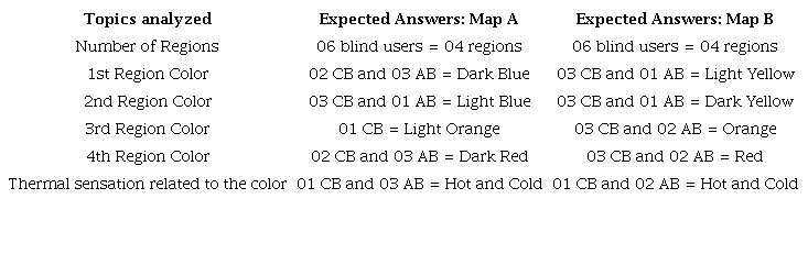 At the end of the tasks, one of the congenital blind people commented that it was difficult to associate colors with a thermal sensation because she never saw the colors. At the time, the researcher asked the participant if she knew the color of the sun and the color of the sea and she answered yellow and blue, respectively. Then, the researcher asked if she knew the feeling of sunbathing and sea bathing, and if so, which of the situations would be warming or cooling. Then the participant answered that the sun warms, that the sea cools and concluded: “if you had given these examples before the tasks, it would be easier for me. I would have replied that yellow represents hot thermal sensation and blue cold thermal sensation”. Thus, new interventions can be applied in future experiments to investigate how blind users could relate colors to spatial phenomena from perception of themselves and later propose spatial analysis tasks with color codes on tactile maps to evaluate the effectiveness of See Color as a graphic language in the process of acquisition of spatial knowledge.