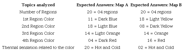 It was found that the chromatic perception of participants in basic education was similar and more compatible with the meaning of the color codes. It was noted that for this group of users, the sequential color scheme of Map B was more appropriate for hot regions with low thermal amplitude. Regarding the colors of this map, 14 users answered that the first region was light yellow, 04 defined the second region as dark yellow, 06 defined the third region as orange, and 07 answered that the fourth region was red.