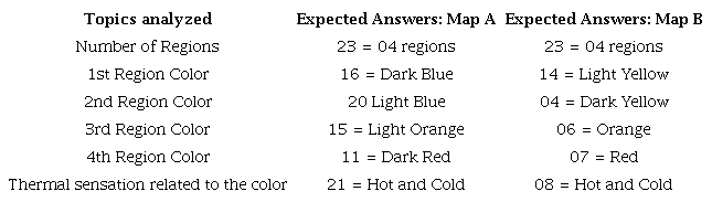 For both types of blindness, the perception of colors through the reading of the color codes in the diverging scheme of Map A resulted in 19 equal responses for the same codes, whereas the reading of the color codes on Map B, which was created in a sequential scheme, resulted in 21 equal responses. The amount of correct answers on Map B was greater than on Map A because in the sequential scheme there was one primary color code (red) and a secondary color code (orange), which are less complex than tertiary color codes. The correct answers regarding Map B may also be related to the first experience users had just had with Map A, which improved their perception for the second test. As for the thermal sensation related to the colors, four participants correctly informed that there were hot and cold regions on Map A. Most of them (03) were adventitiously blind. Two congenitally blind participants said that nothing could be inferred based on the colors. Regarding Map B, two participants correctly informed that there were hot and cold regions. Two reported that there were only hot regions, and two congenitally blind participants said that nothing could be inferred.