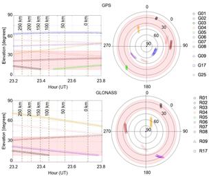 Figure 9 presents the results considering a CAT-I approach, GAD-A parameters and σvig estimate in 50 km distance intervals. The graphs on the left side correspond to the results without the screening, while on the right side are the results of the exclusion of satellites that presented σvig greater than 4 mm/km. It is noteworthy that the protection levels are null for the 0-50 km block due to the lack of pairs of stations in this mileage range for the σvig estimate. Figure 10 shows the elevation of the GPS and GLONASS satellites available as a function of Universal Time, as well as the respective skyplots.