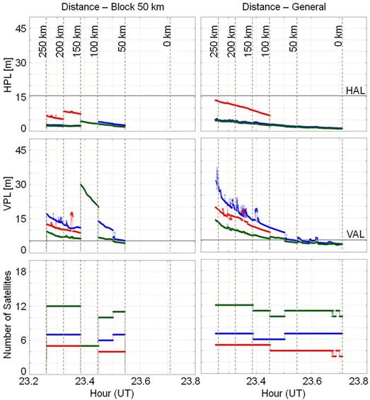 From Figure 9 it can be seen that the HPL values fully satisfy the 40 m HAL for CAT-I. Regarding the vertical level, it is noted that, with the exception of the 100-150 km block and a few moments for the GPS satellites, the other values meet the 12 m threshold established by the ICAO.