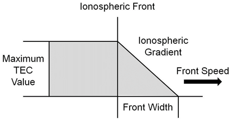 In the CONUS Threat Model, the EIA and ionospheric irregularities are represented as an ionospheric front, which moves at a certain horizontal speed, providing ionospheric error gradients (Mayer et al. 2009). The representation of an ionospheric front is shown in Figure 2, with the model parameters being the ionospheric gradient, the speed and width of the front and the maximum value of Total Electron Content (TEC) or ionospheric delay.