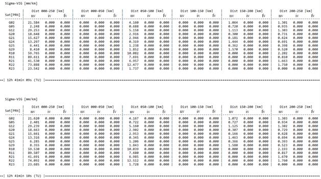 For illustration purpose, Figure 4 shows the screen capture of the software referring to SBBR airport, for the 12:41:09 and 12:41:10 UT (Universal Time) of February 19, 2018, considering the GPS and GLONASS satellites (L1/L2) and a 10° elevation mask. It should be noted that the standard deviations of the initial gradients (iv) and, consequently, the final gradients (fv) are null since there were no ionospheric disturbances during real time processing. Additionally, there are no σvig values for blocks 0-50 km and 100-150 km due to the presence of only a pair of stations in each block, which makes the standard deviation estimate unfeasible.