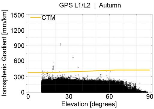 Such estimates considered only phase measurements in L1 and L2 of the GPS satellites and a 10° elevation mask. The ionospheric gradients of the 63 dates as a function of the elevation of the satellites are shown in Figure 5.