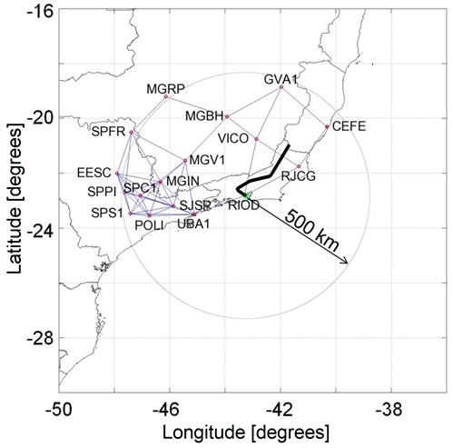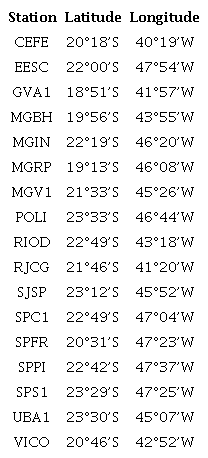 Using 17 stations (Table 4) of the Brazilian Network for Continuous Monitoring of the GNSS Systems (RBMC) (Fortes et al. 1998) available in the region of the Rio de Janeiro International Airport (22°48’S; 43°15’W), and considering 63 days between the years 2000 and 2016 (covering the apexes of solar cycles 23 and 24), a radius of search of 500 km in relation to the airport and a maximum distance of 250 km for the formation of the pairs of stations, firstly, the parameters of the CONUS model for the SBGL airport region were estimated during the autumn period, most affected season based on research by Pereira (2018), following the procedure described in Pereira et al. (2017).
