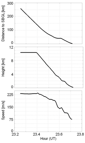 Figure 8 illustrates the aircraft’s temporal variation in terms of distance to SBGL, height and speed of the last kilometers. It can be seen that the aircraft starts the approach procedure at around 23:24 UT, that is, 20 minutes or 150 km away from the airport, at which point the height and speed begin to be reduced.