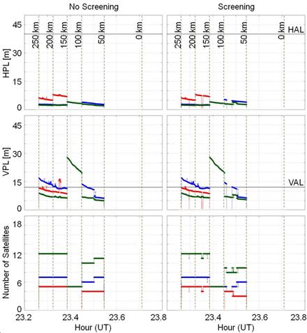 Regarding the screening technique, it should be used only when there is a high number of satellites available, because, otherwise, the excessive exclusion of satellites above the 4 mm/km threshold of CONUS Threat Model provides a worsening of spatial geometry, thus degrading the estimate of protection levels, as can be seen in the case of GLONASS satellites at 23:30 UT, which after the exclusion, only three satellites remained, making it impossible to estimate VPL and HPL. In contrast, using the two constellations concomitantly, it is observed that, after the screening, at least 5 satellites are available, which reflects in the VPL estimate in particular, practically meeting the CAT-I threshold.