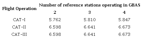 where Kffmd (fault-free missed detection) is the quantile of a unit Gaussian distribution corresponding to α (Lee 2005). Rowson et al. (1998) also emphasize that Kffmd is a multiplier that represents the probability of detecting errors in the pseudorange; its value depending on the number of reference stations operating in the GBAS system and the type of flight operation. Table 3 shows the Kffmd values for CAT-I, II and III (Rowson et al. 1998).
