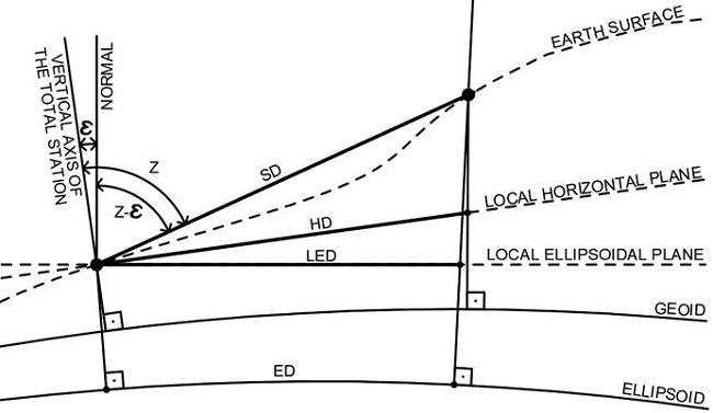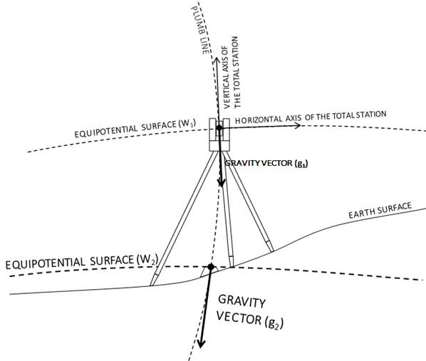 During data acquisition with total station, a sine qua non condition for taking a measurement is that the vertical axis must have the direction of the gravity vector at the point of intersection of the vertical and horizontal axes of the total station; thus referring all subsequent measurements to this reference. Terrestrial geodetic observations are related to the local vertical, and thus delivers results orientated in local gravity vector orientation g (Seeber 2003 p. 21; Torge and Müller 2012 p. 203).