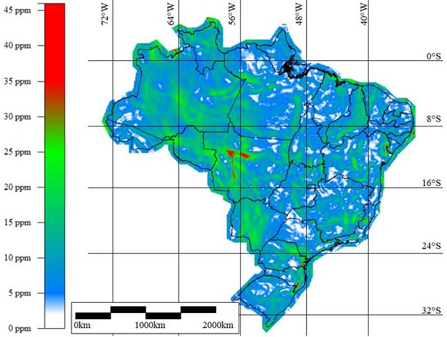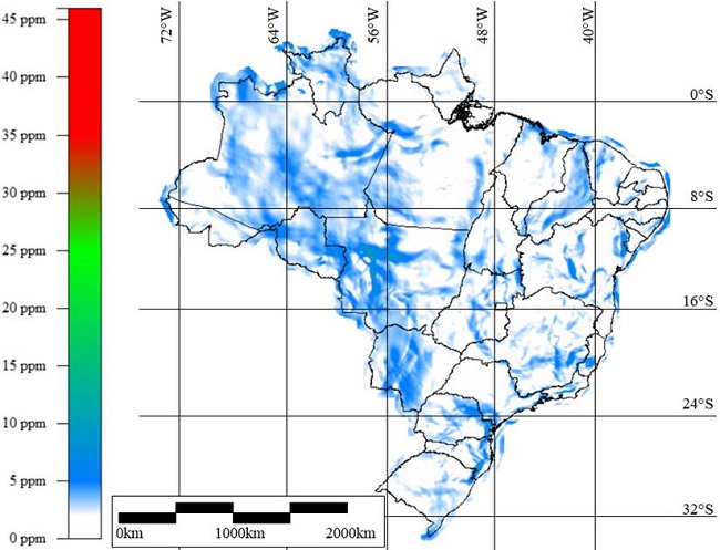 In order to illustrate the behavior of the influence of the θ on distance, and consequently on geodetic horizontal positioning for the entire Brazilian territory, it were calculated the values of in parts per million (ppm) for zenith angles of 85° and 70° (Figures 10 and 11). It should be pointed out that both the map of the θ values (Figure 5), and the results obtained for the influence of the θ on the horizontal geodetic positioning (Figures 10 and 11), are presented for the first time with focus on the Brazilian territory.