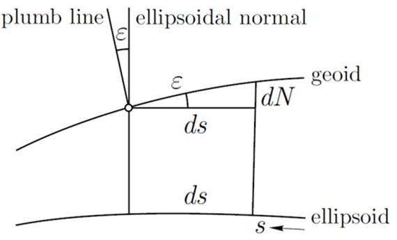 Equation 5 demonstrates the mathematical relationship between the variation of the geoidal undulation (dN) and the ellipsoidal distance (ds), where ε is in meters per meter (thus equivalent to radians) and its sign indicates the direction to be considered at the zenith angle.