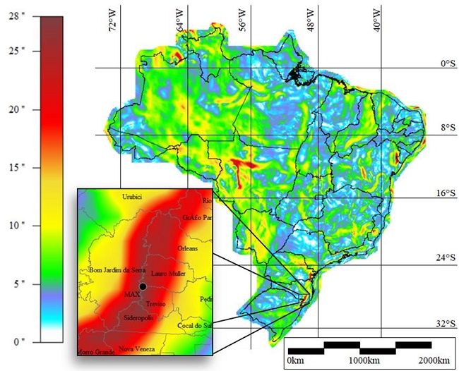 Figure 5 illustrates the magnitude of deflection of the vertical in the Brazilian territory. It can be observed values ranging from 0” until up to 28” in specific regions. The average θ was 5.7” and the maximum was 28.4” in the south of Brazil, along the Serra do Mar region. The maximum θ location is a canyon region with a high slope (Figure 6). But other regions with high θ values are not associated with large height variations. Usually, total stations have an angular accuracy better than 5”. Therefore, the neglect of the θ may become a source of error greater than the angular standard deviation of the instrument.