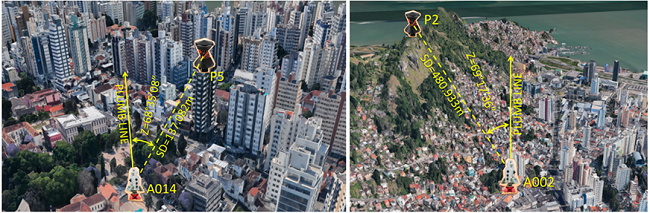 For the zenith angles, the closer to 90° (horizontal line of sight), the lower will be the influence of the θ. Klein et al. (2017) show a real case of geodetic network implementation in an urban area, where geodetic markers were placed in strategic points of high visibility, such as on top of hills and buildings (Figure 7). From possible line of sights of the geodetic network markers on the ground, Figure 7 shows zenith angles measured at 68° and 69° (A014 for P5 and A002 for P2, respectively). In this way, it was considered zenith angles from 89° to 70°, even though it is physically possible to measure zenith angles of the order of approximately 40°, but in practice it is very unlikely.
