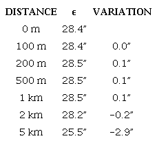 Another important aspect that must be analyzed is the variation of the among the points occupied by the total station and the reflecting target. Different locations will have different gravity vector directions, as well as different directions for the normal. In order to analyze the magnitude of these variations, we also simulated in the region of maximum θ the variation of the ε in distances of 0 to 5 km in the geodetic azimuth of 114°. This azimuth is the direction generated by the components η =+25.8” and ξ = -11.8”, obtained in the highlighted point of Figure 5.