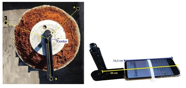 There is a forced centering device (a standard screw) on the pillar that makes it possible to position a geodetic antenna on it. In addition, three auxiliary points around the center were considered, at a fixed distance of 20 cm from the central point (on the left of Figure 1). The fixed distance was possible by means of a special support (Figure 1).