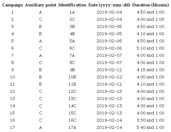 Each field campaign had an average duration of approximately 4 hours. However, each campaign was also processed using only the first initial hour. The general characteristics of the campaigns are shown in Table 1.