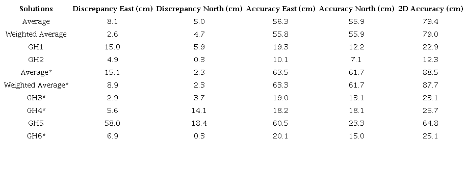 With the exception of the set with 1 hour, removing the outliers (GH4*) improved results. The gain percentage was approximately 48%, 42% and 46%, for the East, North and 2D accuracy, respectively.