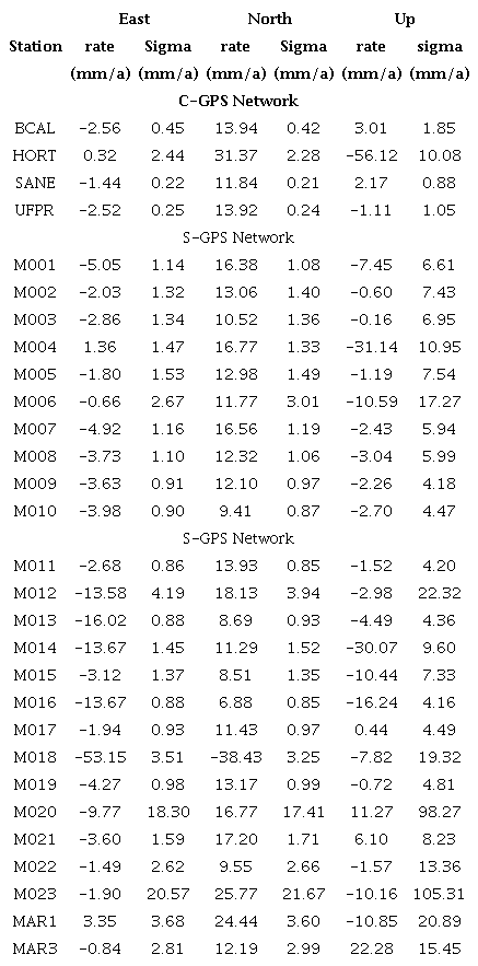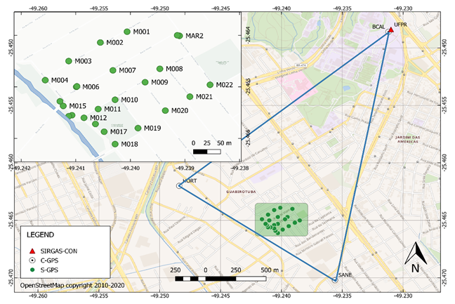 Nine survey-mode GPS campaigns were carried out between 2014 and 2019 for a group of 29 stations divided into two hierarchical networks: a survey local network (S-GPS) composed of a set of 26 multi-period GPS stations with sessions lasted from 1 up to 4 hours and a core local network (C-GPS) composed by a set of four semi-permanent stations, including an IGS Station (UFPR 41610M002), with sessions of 24 hours (Figure 1). The approximate distance between the survey local network (S-GPS) and the core local network (C-GPS) is 2 kilometres. In all cases, observations were conducted at a sampling rate of 30 seconds and an elevation mask of 10°. A more detailed explanation of different campaigns and sessions made are described in Table S1.