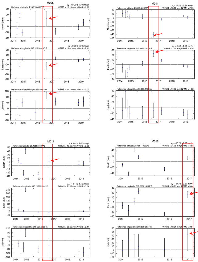 In the series, a clear discontinuity corresponding to the sixth campaign (red arrow) is observed (mainly at the East component). By the way the discontinuity appears in the series, and mainly its magnitude, suggests that it may be correlated with a physical process as a result of an isolated local dynamics.