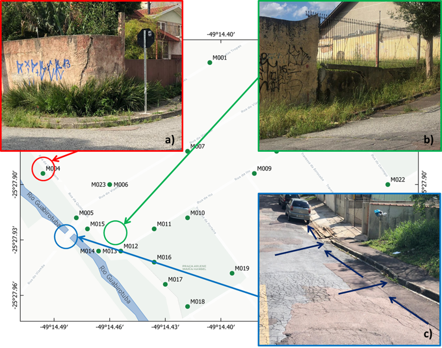 Figure 2 shows three important points of the study area, where road and structure issues related to possible landslide processes can be observed. In Figures 2a and 2b, for instance, it is possible to observe cracks in the walls of two houses (GPS sites M014, M012 respectively) probably caused by earth and debris flows. Figure 2c, for its part, shows the collapse of the road that passes over the Guabirotuba River, as a result of a potential erosion process (Werlich 2017).