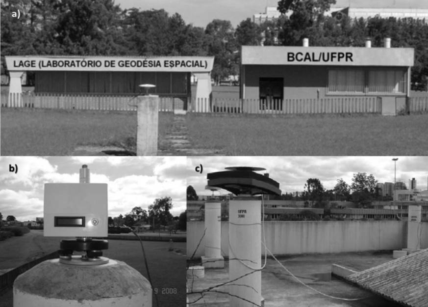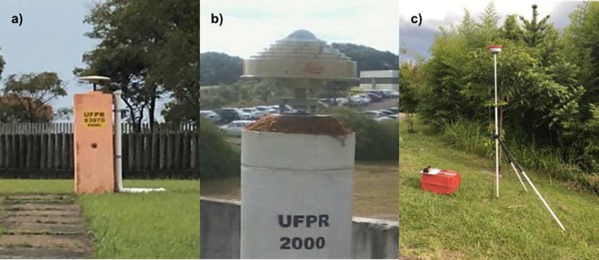 The main difference between S-GPS and C-GPS networks lies in the session characteristics (i.e., campaign and session duration), which have been defined based on the GPS site monumentation, type of receiver and antenna used, and the characteristics of the study area. Thus, for the C-GPS network, all stations have reinforced concrete monuments with forced-centring apparatus for antennas (Figure 3a and 3b). For the S-GPS network, being a non-continuous network, its stations are materialized through a tripod-mounted station placed directly on top of a survey benchmark (approximately 2 m above the Earth’s surface) (Figure 3c).