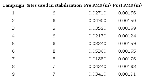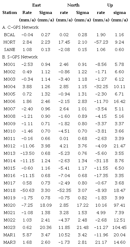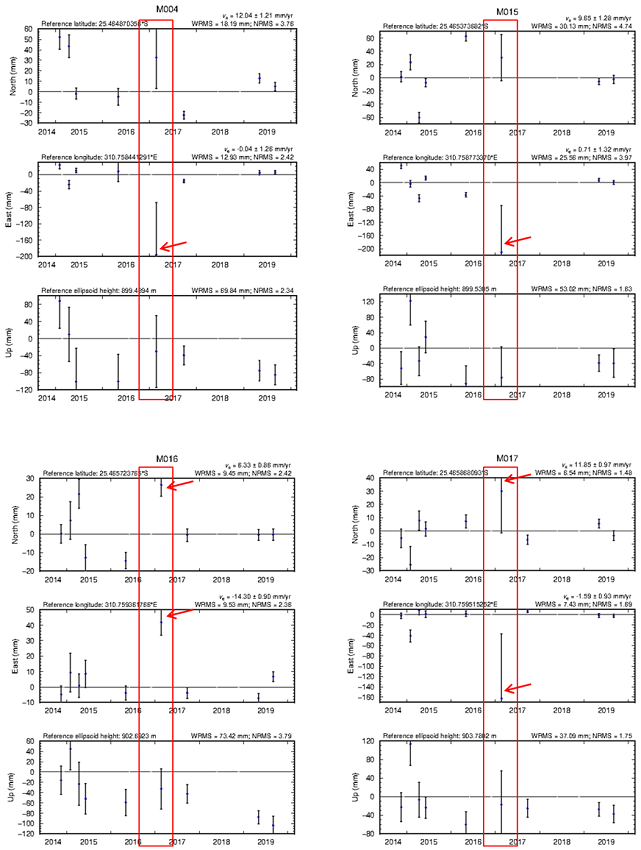 It is important to note that other stations located in the same area (e.g., M005, M011, M014, M18 sites) (Figure S3 and S4), also present a similar perturbation for the sixth campaign, but in many of them, the large uncertainties of data make that the discontinuity have a low weight in the inversion/Kalman-filter process (i.e., the scale of the outlier close to the error) and therefore it remains in the time series. This consistency of variations between nearby sites, as demonstrated by Herring et al. (2015), proves the effect of reference frame stability and suggests that apparent slight outlier may likely be an effect of poor reference frame stabilization or an irregular perturbation in the data. To evaluate this precept, Table 1 shows the statistics obtained for the final iteration performed for each campaign as part of the stabilization process.