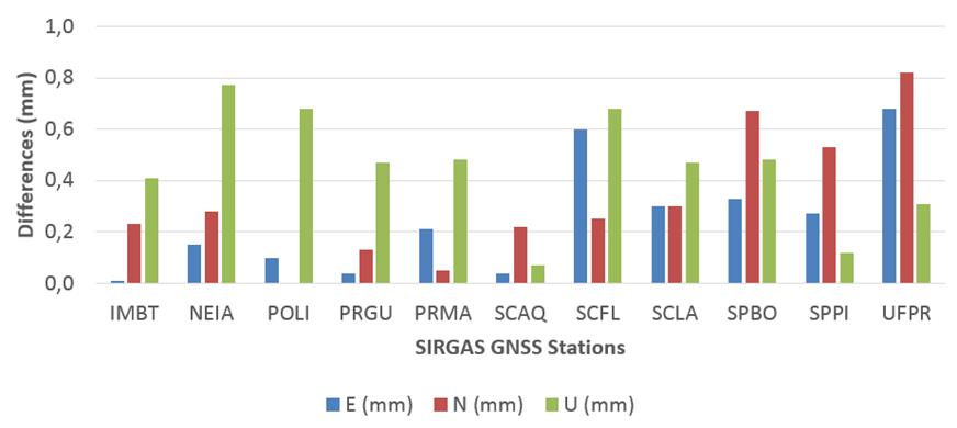 According to that, mean absolute differences of 0.25 mm, 0.32 mm and 0.45 mm can be obtained for the East, North and Up component, respectively, which, in principle, can be considered statistically equivalent at the 0.05 significance level (Table S3).